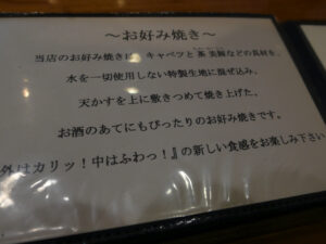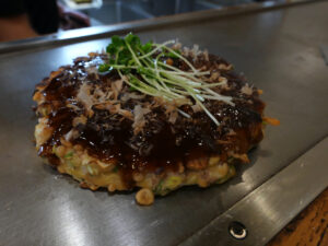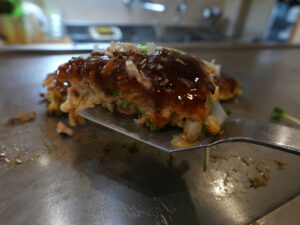 厨房内の鉄板で調理されたお好み焼きが届く。