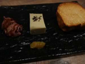 右からブリオッシュ フォアグラのパテ 白肝のコンフィ
