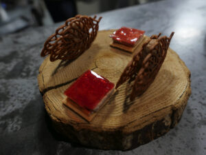 庄内で三元豚のリエットをチーズのチュイルではさむ