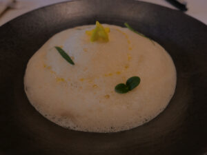 ムースのなめらかで溶けるような舌触りと鼻に抜けるトリュフの香りに始まり、食感の楽しさや油脂分、柑橘の爽やかさなど、いろんな「食べるスイッチ」を押してくるような一皿。