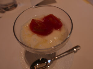 トマト水をシロップに仕立て、コンポートをのせた。