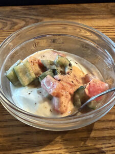 ヨーグルトはトマト、キュウリ、クミンを和えたサラダ。