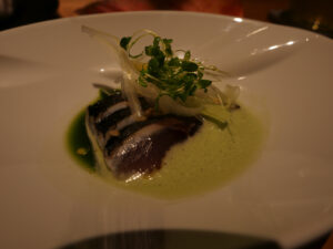 軽くスモークしたトキシラズに焼いた椎茸 そこに古代醤とオリーブオイルを合わせる。