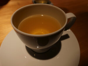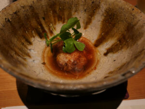 柿の葉茶の苦味と発酵した印象をトリュフの香り シェリービネガーはポン酢の役割。