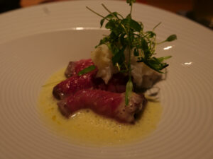 「自家製塩鱈と大和牛のタルタル 白菜漬けのクレマ」