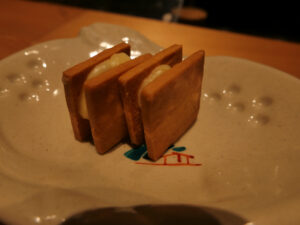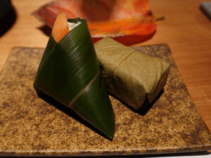 子持ち鮎は柿の葉茶のほうじ茶で柔らかく炊き上げ甘露煮に。香りのベールは柿の葉茶で。一方宇陀牛蒡は甘辛く炊き上げコーヒーの香りをつける。シャリには柿酢を使う。このコーヒーのインパクトは強く、途中でオリーブオイルと塩をつけると味わいの印象が変わる。