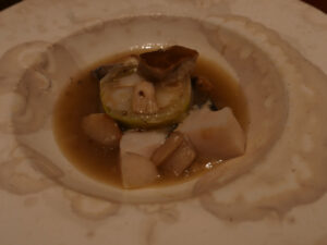 ホタテのムース、手長海老などをクネルのように仕立てる