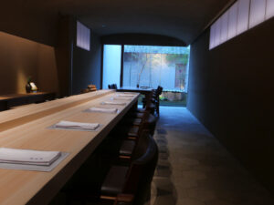 瀟洒な店内、長く伸びたカウンターの奥には小さな坪庭がある。