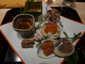 たたきごぼう 真珠貝のおかき揚げ