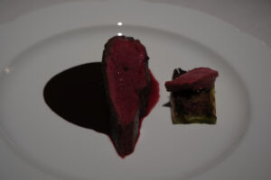 Canard grillé sur pierre de lave avec cassoulet, sauce au sang