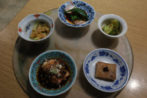 よだれ鶏、ザーサイとクラゲ、雲白肉、大根餅、きゅうりの甘酢など