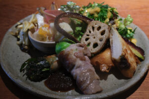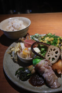 プレートに多種のおかずと土鍋で炊く玄米ご飯。