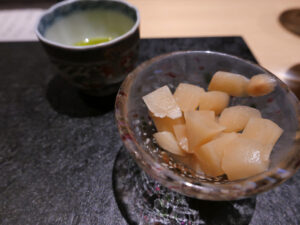 隣のオリーブオイル(手づみで収穫4時間以内にプレス)に漬けると梨のような味わいに変化する。