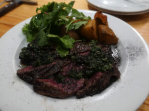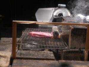 素材に炭を乗せるスタイルはよく見るようになったが、魚が多く肉では初めてかもしれない。