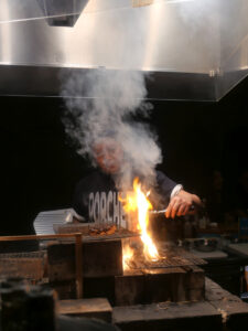 樫村仁尊シェフが炭火を操り肉を焼く。