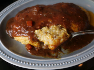 ご飯を食べる、とろとろのオムレツのふくよかさとカレーが心地良さそうに手を結ぶ。