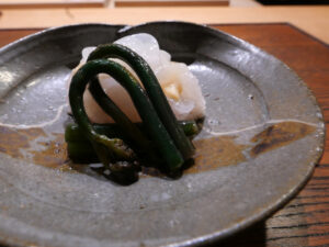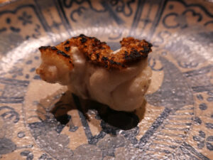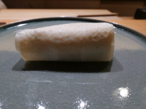 細やかに包丁目が入っているので、単純に噛んだ時の感触と異なり舌の上で蛸が一気に広がり、蛸が口の中を覆い尽くすような感覚を覚え、味の深みが炸裂する。