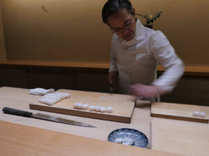 カウンターでは中村さんが蛸に細やかな包丁目を入れる。